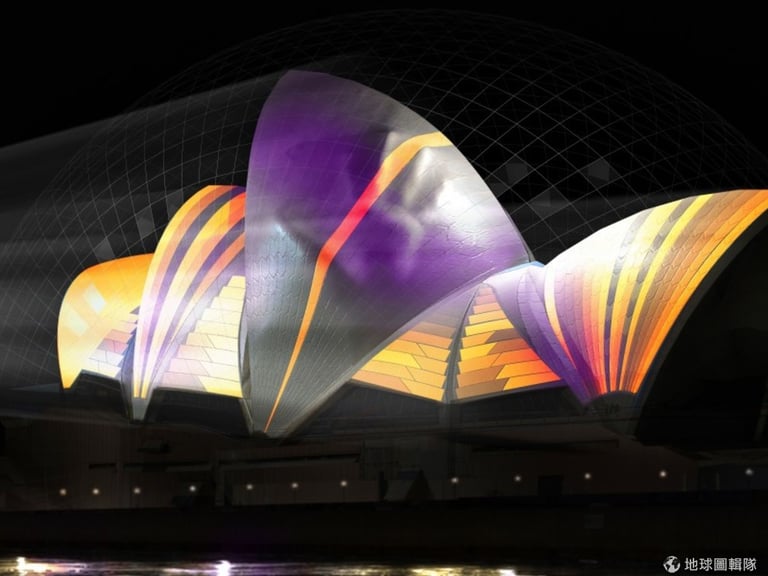 雪梨歌劇院獨特的形狀讓藝術家想出不同的畫面,你覺得畫面中的圖案是甚麼東西呢?Cameron Spencer/Getty Images