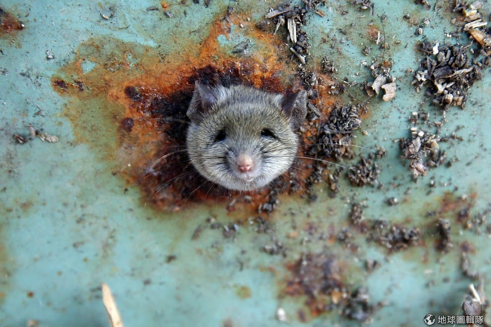 一隻小老鼠的頭被卡在腐鏽的垃圾桶底。