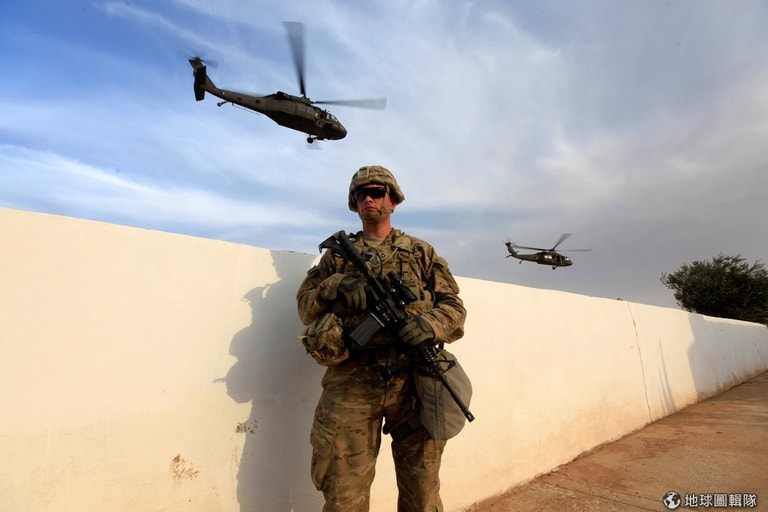 一名聯軍士兵手拿武器在基地待命,他的頭上飛過多架軍用直升機,等待攻打伊斯蘭國(IS)的時機。