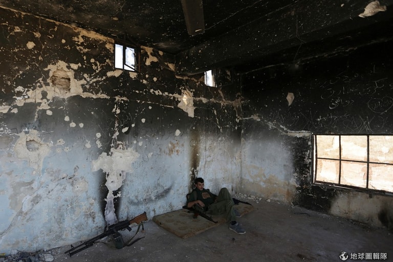 一名反政府軍在阿勒坡城內一棟破敗的建物內休息備戰。