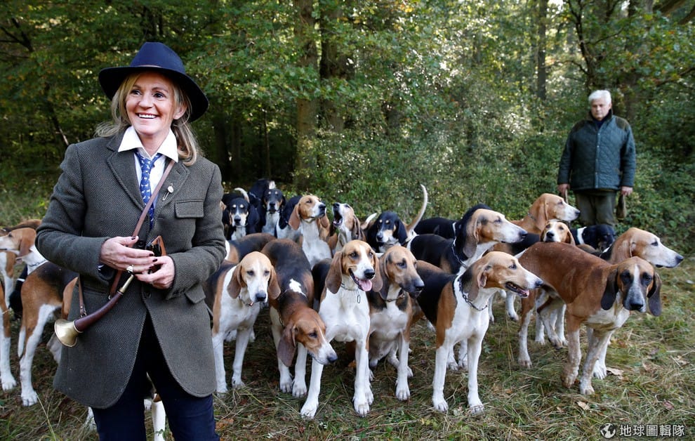 打獵體驗公司「在王子間騎馬」(A Cheval chez les princes)創辦人博耶(Maite Boyer,左)身後帶著一大群獵犬,準備進入巴黎北方的尚第伊皇家莊園森林追捕獐鹿的蹤跡。