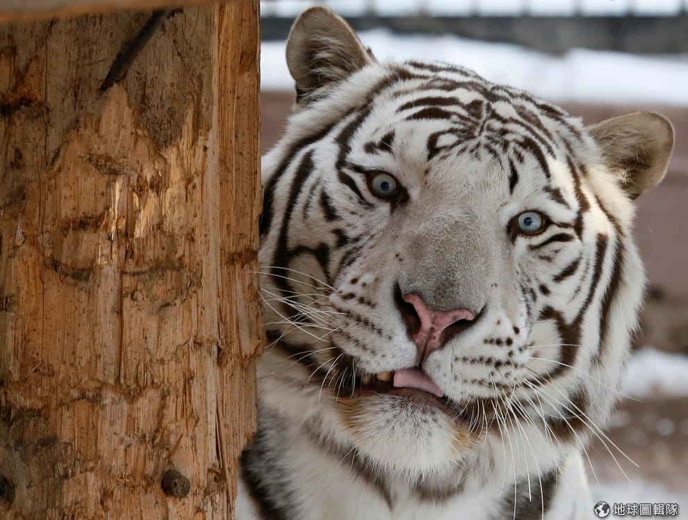 今年五歲的孟加拉白老虎可汗(Khan)看向鏡頭,目前牠住在西伯利亞偏鄉克拉斯諾亞爾斯克(Krasnoyarsk)當地的動物園內。