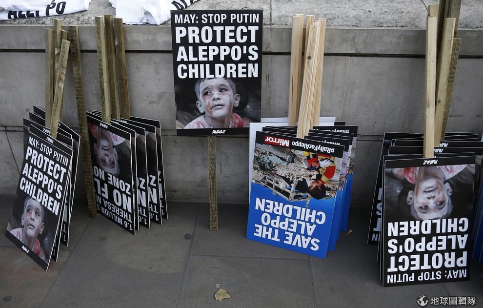 示威人士聚集在唐寧街 10號前方,希望英國政府能夠對天天遭到空襲的阿勒坡做點什麼。在抗議現場的一旁,寫有「保護阿勒坡城的小孩」、「救救阿勒坡孩童」的牌子被堆置在角落。