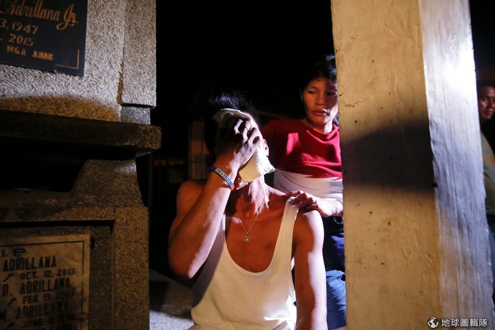 一名妻子正在安慰悲痛的丈夫,他們的 7歲女兒在馬尼拉(Manila)的公墓墓園遭到殺害。當地媒體報導,警方已經根據毒販自首名冊拘留了一位嫌疑人。