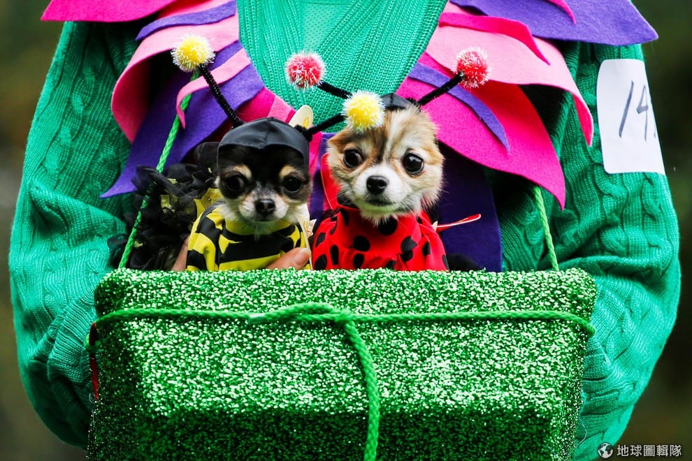 紐約曼哈頓湯普金斯廣場公園正在舉辦萬聖節狗狗大遊行,穿上奇裝異服的狗兒們被主人帶上街頭互相較勁。