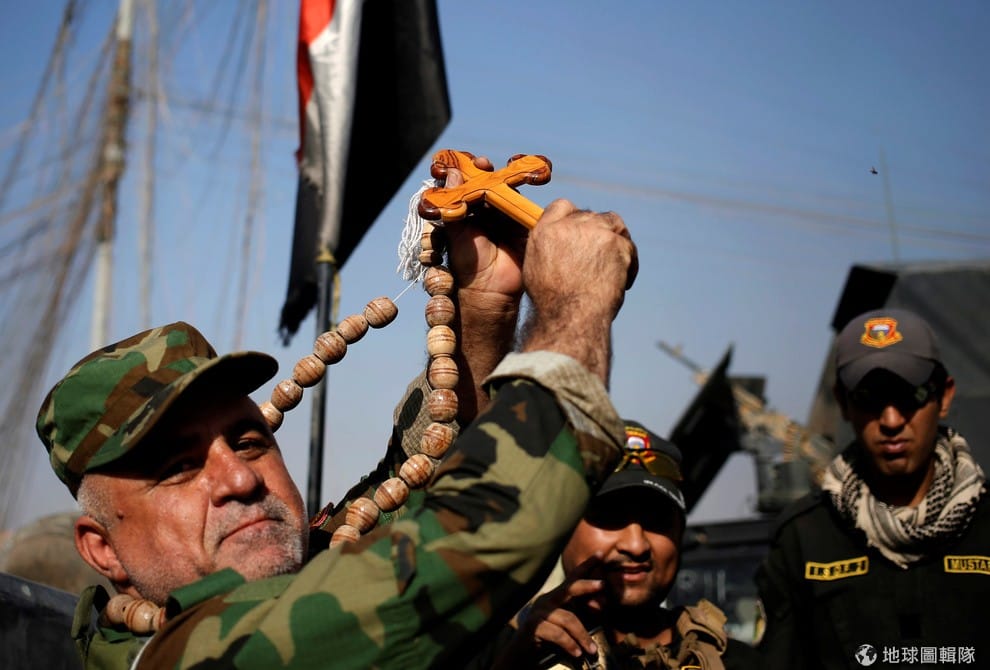 在東部摩蘇爾城(Mosul),一名信奉基督教的軍人高舉十字架,帶領伊拉克特殊武裝部隊前進。