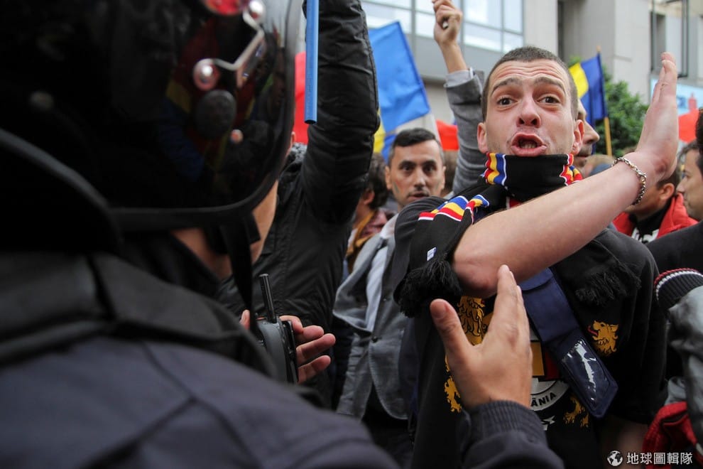 一群羅馬尼亞人上街爭取羅馬尼亞與鄰國摩爾多瓦的統一,在過程中與憲兵爆發衝突,照片中的男子正對著維持秩序的憲兵大喊示威口號。