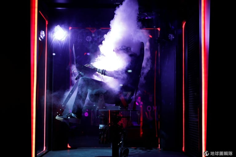 巴黎電玩展盛大進行中,一名玩家在煙霧特效的環繞下,待在玻璃箱子裡認真地玩著遊戲。