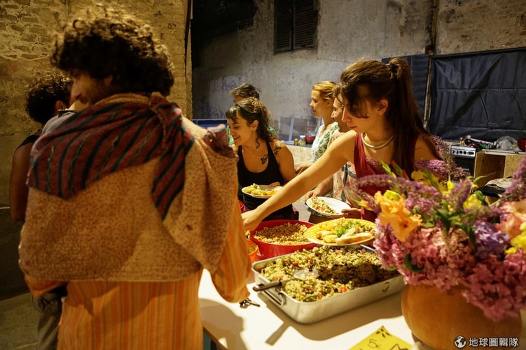 在建築物Cavallerizza Reale內,一個名為「14:45 聚集Cavallerizza」的團體正在供餐給前來的訪客。這座建物有著 300年的歷史,其用途也從軍事學校、警用停車場、公家單位一路演變到電影製造廠。2009年,當市政府決定要將這棟建物轉手給其他公司時,大批民眾聚集就是不希望建築易主。