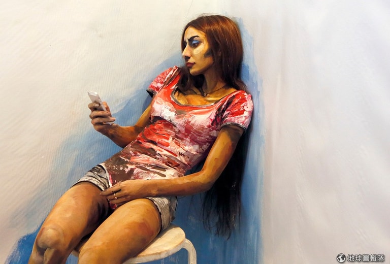 西伯利亞偏鄉克拉斯諾亞爾斯克(Krasnoyarsk)正在舉辦年度藝術展,藝術家加薩諾瓦(Maria Gasanova)以「活體繪畫」為題,展示她的彩繪作品。作為「畫作」的模特兒瑪勾美黛娃(Inna Magomedova)坐在牆邊,以滑手機作為展示。