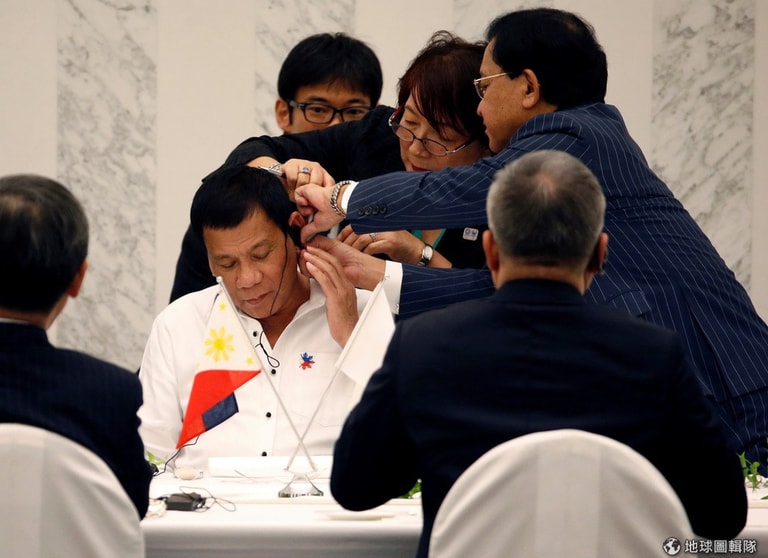 菲律賓總統杜特蒂(Rodrigo Duterte)出訪中國後,日前轉往日本拜會。圖中他正在與日本企業大老一同進行午餐會議,翻譯官們也忙著把翻譯耳機架設好。