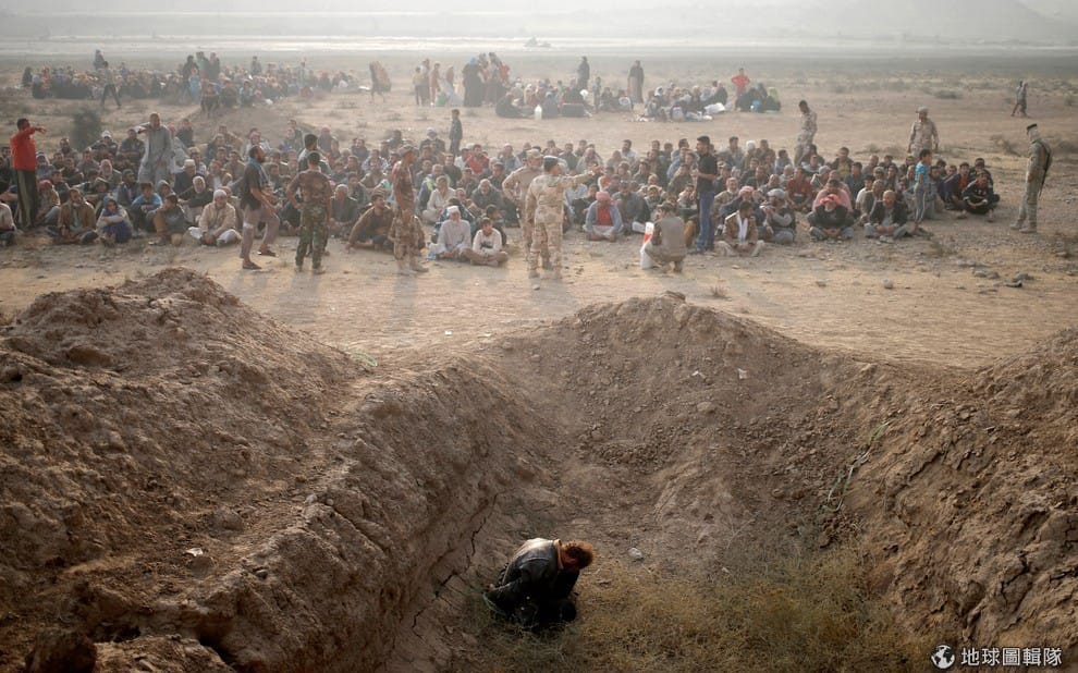 一名遭指控是伊斯蘭國(IS)的男子試圖混進從摩蘇爾城(Mosul)逃離的人們,因而被軍隊單獨拘留在一旁。