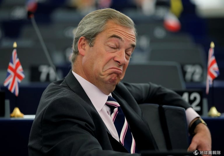英國獨立黨(United Kingdom Independence Party,UKIP)前主席與現任黨員法拉吉(Nigel Farage),同時也是歐洲議會(MEPs)議員,出席在法國舉辦的歐洲高鋒會,他正在等待上台辯論。