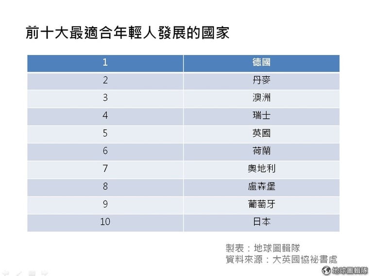 另一邊,排行榜中最適合年輕人發展的國家都落在歐洲,第十名則是位於亞洲的日本,美國則在 183個國家中排第 23名,台灣則排第 51名。