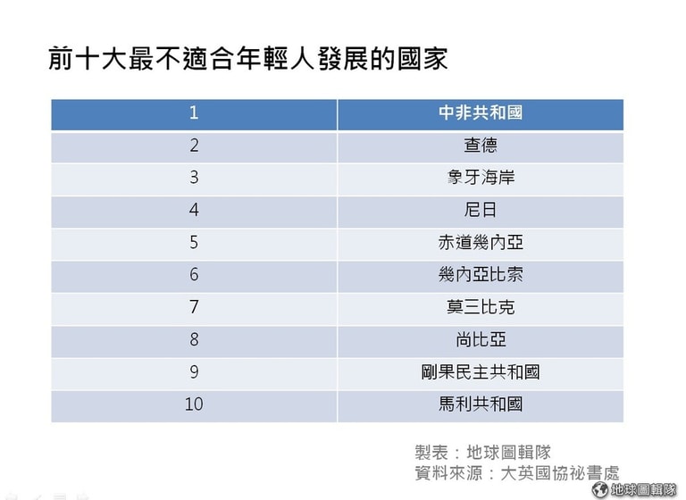 仔細檢視報告中的排名,有些結果並不令人意外。舉例來說,在 183個國家中表現最差,最不適合年輕人發展的中非共和國,從 2013年就飽受內戰和宗教衝突所苦,然而,被列為第三不適合年輕人發展的象牙海岸,卻是西非國家中最有前途和經濟表現最佳的國家之一,而象牙海岸之所以分數被拉低,是因為當地教育、衛生福利和公民參與做得不夠所致。