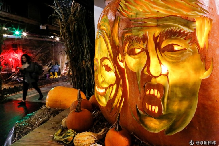 一顆刻著美國民主黨總統候選人希拉蕊(Hillary Clinton)與共和黨總統候選人川普(Donald Trump)頭像的大南瓜被擺在大街上展示著,這幅作品是由雕刻大師麥克馬洪(Hugh McMahon)所完成。