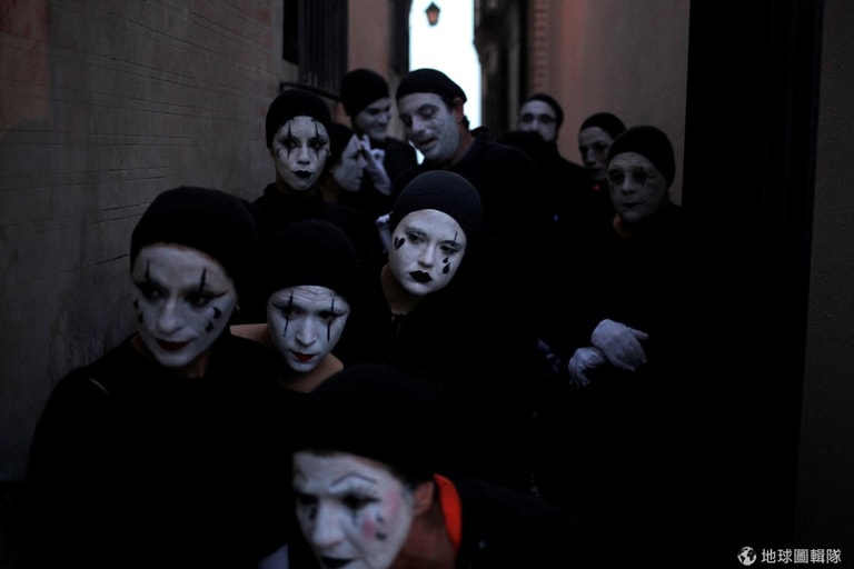 人們打扮成默劇演員的模樣,聲援西班牙南部大城馬拉加(Malaga)城內的難民。