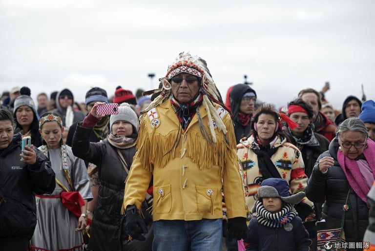 圖為立岩蘇族(Standing Rock Sioux)酋長「馬兒守護者阿爾弗」(Arvol Looking Horse),他正帶領著族人在「達科他輸油管」(Dakota Access Pipeline)建設地前祈禱。立岩蘇族擔心,設立油管會污染當地的文化遺產與水源,因此從今年 4月開始便集結了 200個部落參與這場抗戰。