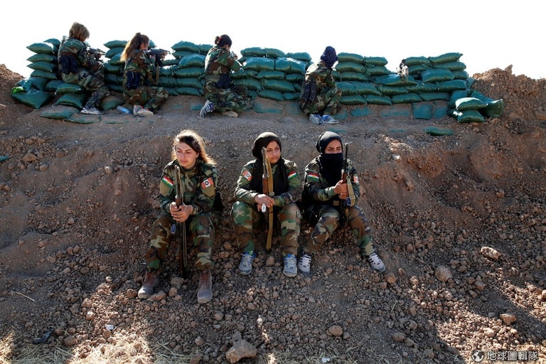 伊拉克摩蘇爾城(Mosul)近郊,3名庫德族女戰士坐在壕溝後方休息,其餘 4人則在沙袋後警戒著。