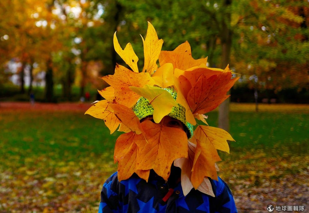 一名小男孩跟著家人在法蘭克福公園中散步,他隨手撿起地上掉落的楓葉插滿頭。
