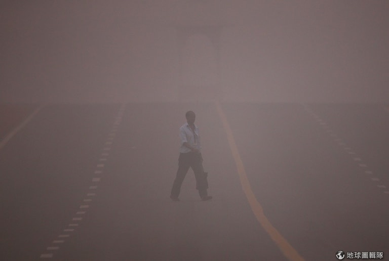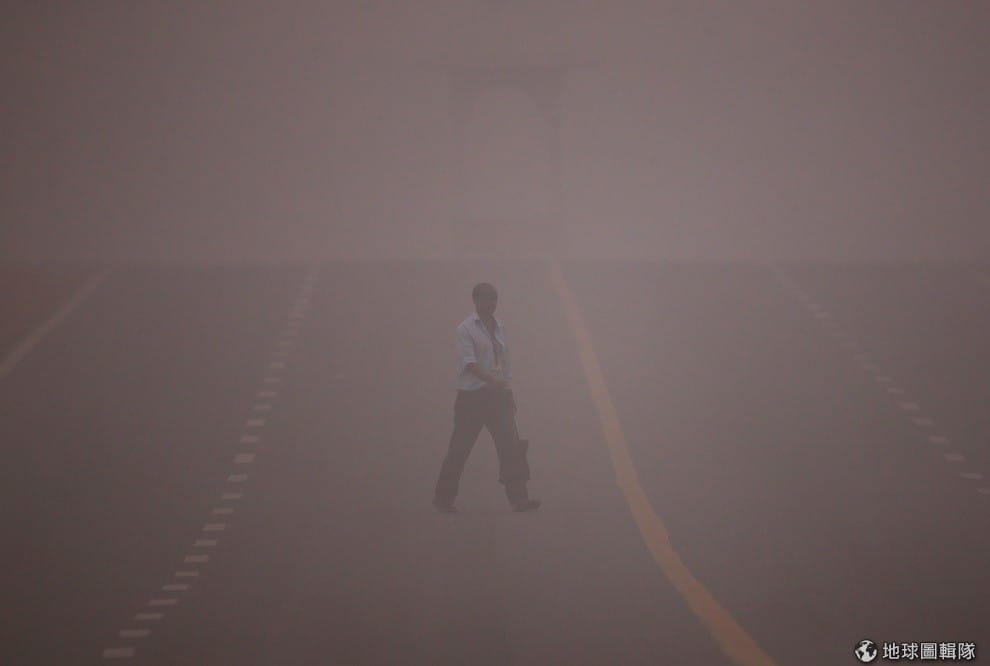 一名男子在深陷霧霾危機的新德里過馬路,此外,伸手不見五指的情況越來越嚴重,人們受空汙影響就快窒息,能見度只有前方 200公尺,多起車禍也因此發生。
