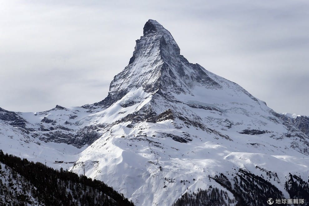 圖為阿爾卑斯山脈,位在瑞士策馬特(Zermatt)的馬特洪峰(Matterhorn)。由於他就是瑞士三角巧克力盒子上的那座山,因此大家都相信創始人是以這座山峰作為巧克力的靈感來源,但是創始人的兒子出來澄清說父親的靈感來源是巴黎女神遊樂廳的金字塔。