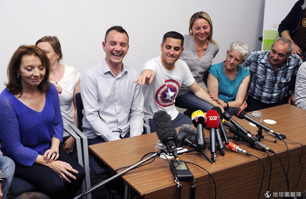 照片中的兩位新人,在姊姊、和爸媽的陪伴下參加記者會。他們的婚禮當天就來了150家媒體採訪,更有警方怕反對分子出現而駐守婚禮現場。PASCAL GUYOT/AFP/Getty Image