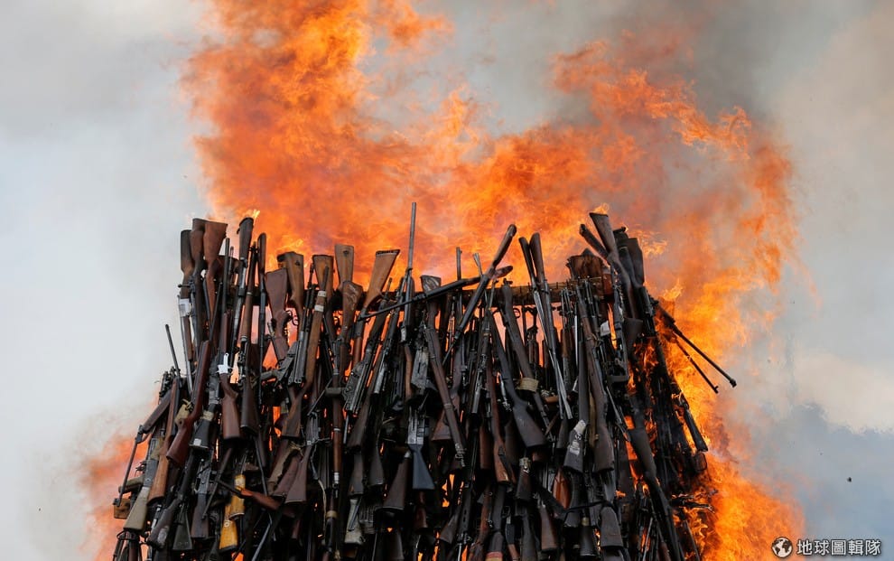 肯亞當局用查緝行動中沒收的 5,250件非法軍武,搭成一座座火堆,放一把火將它們全數燒盡,宣誓打擊國內非法槍械橫行的決心。