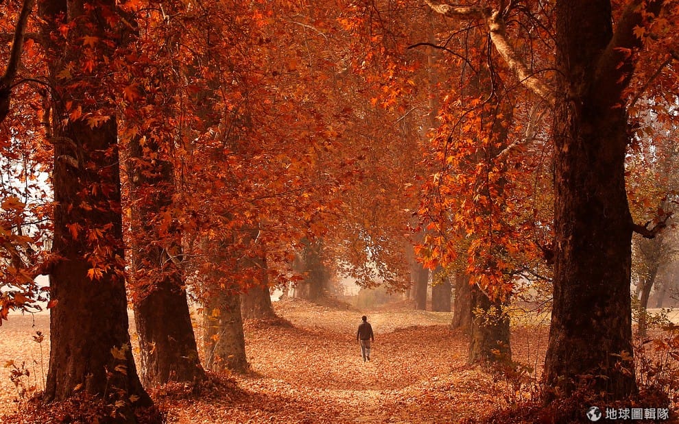 在處處楓紅的公園內,一名男子走在發出沙沙聲的落葉上。