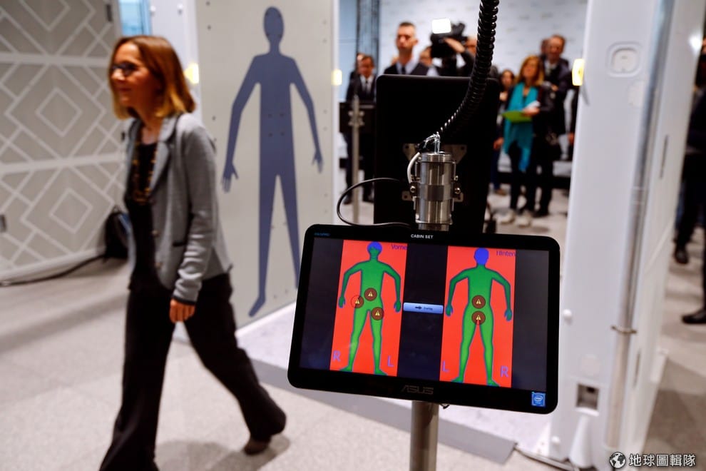 在德國科隆/波昂機場,一名女子通過搭機時一定會經過的偵測門,一旁的工作人員用新上路的偵測系統監控乘客的狀況,避免有攜帶違禁品的乘客登機。