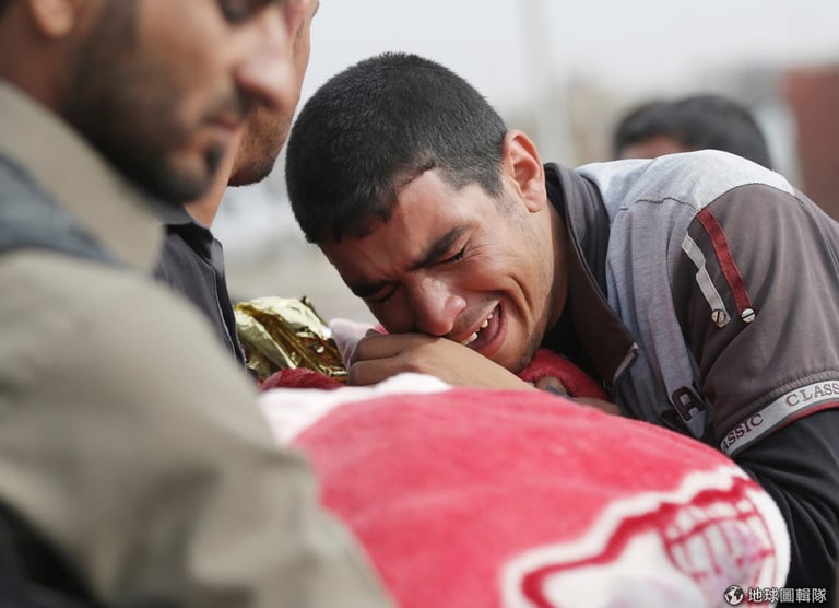 一名男子趴在過世的嬰兒身上哭泣,這名小嬰兒在伊斯蘭國(IS)的迫擊砲攻擊下喪生。