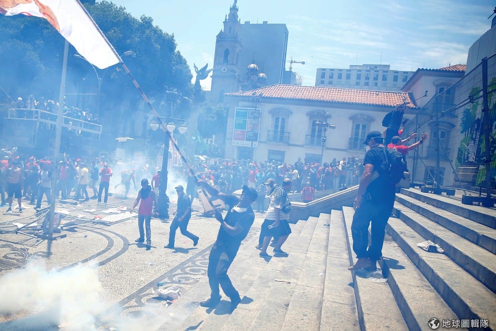 在里約熱內盧州議會前,不滿政府刪減公共預算的公務員齊聚一堂抗議,當局出動鎮暴警察發射催淚瓦斯企圖控制現場。