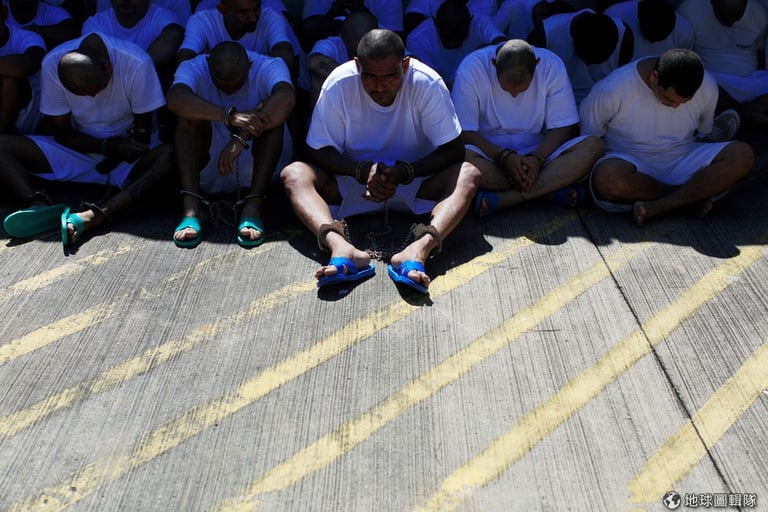 MS-13黑幫成員戴著腳鐐和手銬,坐在地上等待進入重刑監獄。根據《維基百科》的資料,MS-13是一個發源自美國洛杉磯的黑幫組織,規模龐大不法勾當多,原為 1980年代薩爾瓦多人為了幫助同鄉而成立,隨後幫內也接收來自宏都拉斯、瓜地馬拉和尼加拉瓜等中美洲國家的移民,勢力越來越大,也成為美國治安的漏洞。