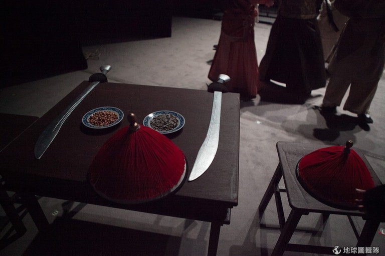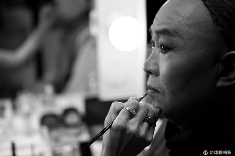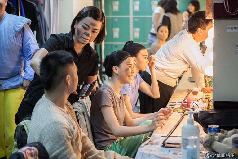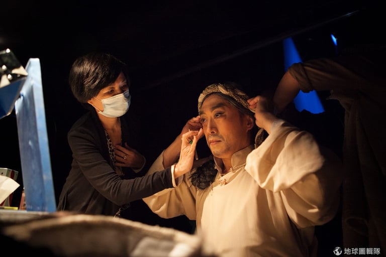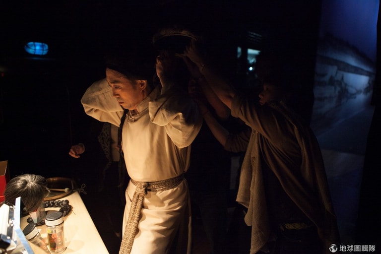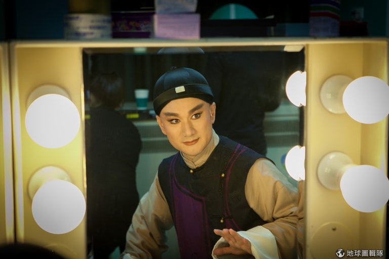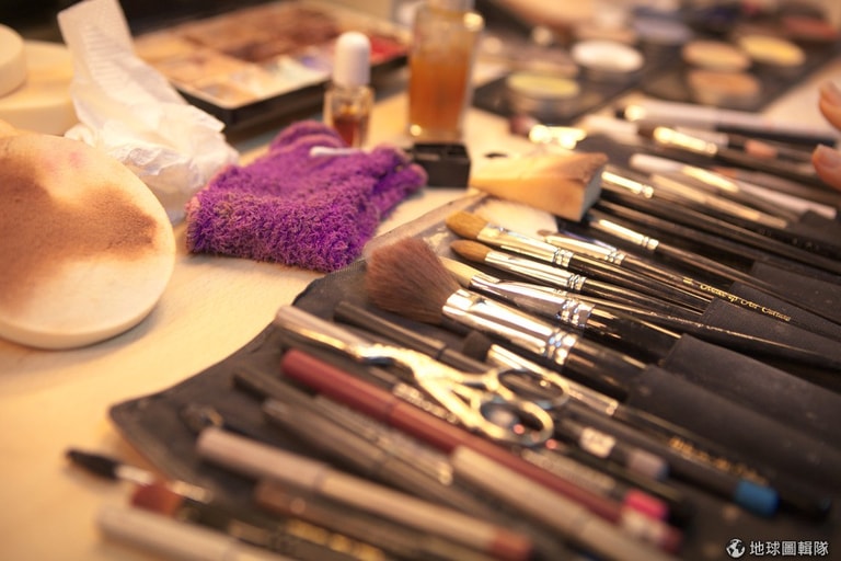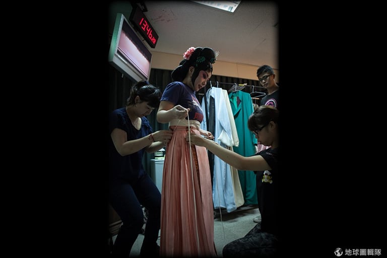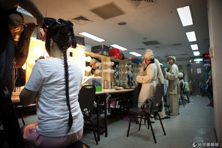 舞台側邊有個快換間,演員在演戲期間,也會應角色的需求,換穿不同的戲服,化上不同的妝,因為時間緊湊,通常會直接在快換間進行。
