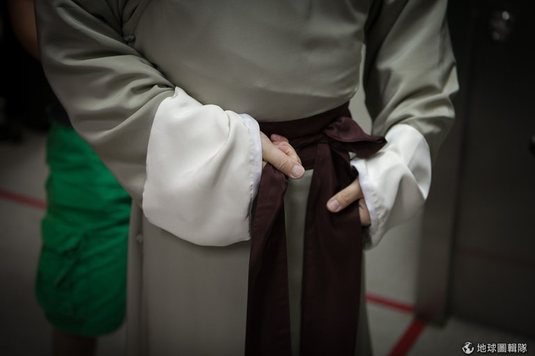 束腰帶的時候,演員幫忙把腰帶固定在腰上,服裝師再把腰帶繞到背後,打出漂亮的結,幾個簡單的小動作,演員和服裝師搭配得行雲流水,默契十足。