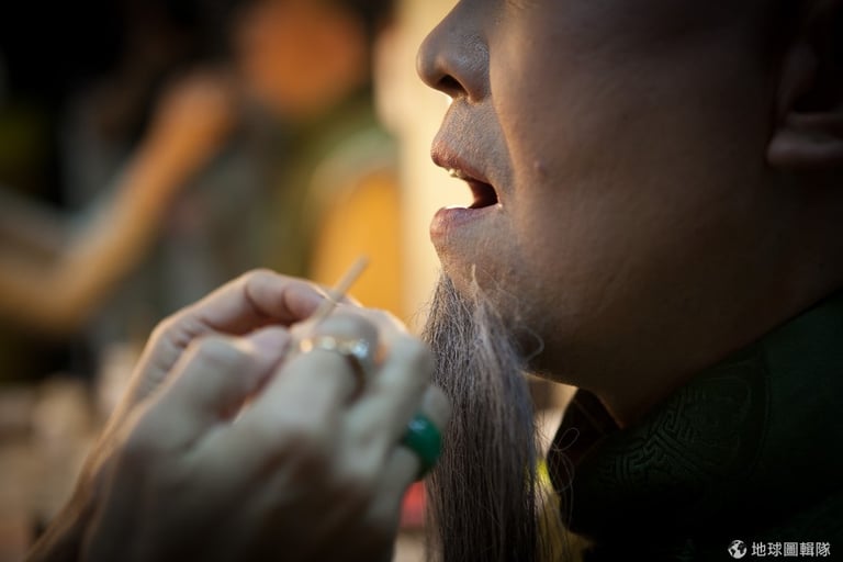 化妝師在鬍子刷上膠水,貼到演員的下巴,小心翼翼地調整好角度,最後用布壓一下固定,讓鬍子變得更加自然。