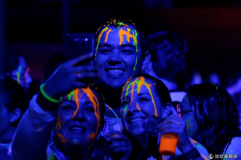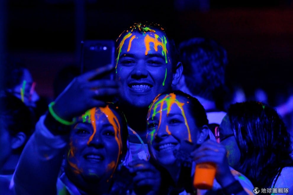 一群到墨西哥城市蒙特雷(Monterrey)參加夜間螢光路跑的民眾,在路跑結束後開心地聚在一起自拍。