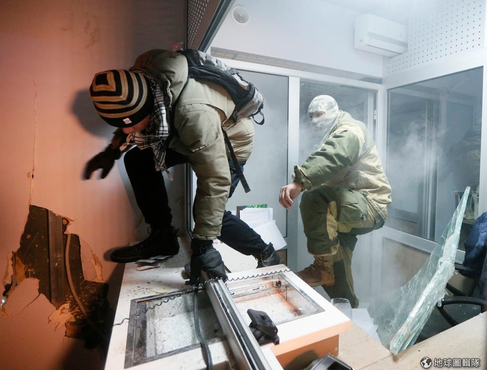在烏克蘭的「尊嚴與自由日」(Day of Dignity and Freedom),國族主義團體和其支持者闖入了俄羅斯聯邦儲蓄銀行(Sberbank)分行,用來紀念 2014年親歐派運動的成功。
