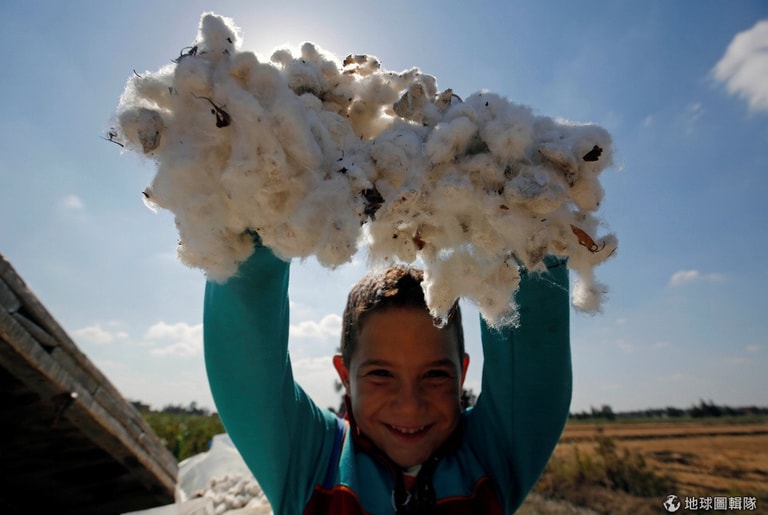埃及首都開羅(Cairo),一名農夫的小孩開心地向攝影師展示剛採收下來的棉花。