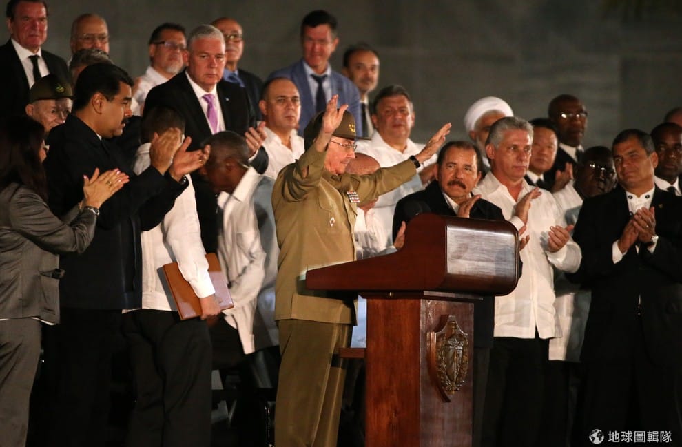 古巴現任領導人勞爾卡斯楚(Raul Castro,中),同時也是已故前領導人菲德爾卡斯楚(Fidel Castro)的弟弟出現在革命廣場,並向眾人揮手致意。