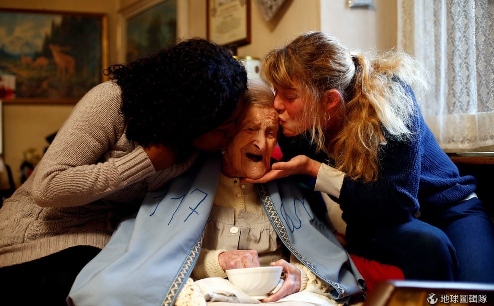 茉拉諾(Emma Morano,中)正在接受眾人的生日道賀,1899年出生的她現在已經 117歲了,是全世界最老的人瑞。
