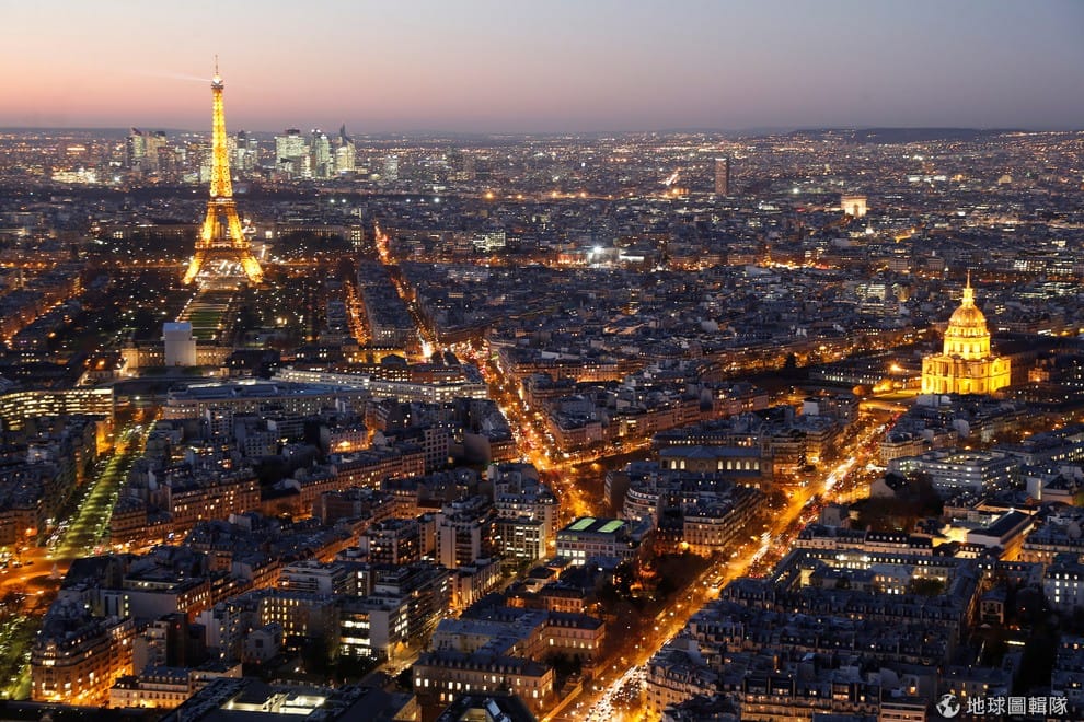 圖為某建築物屋頂所拍下的巴黎夜景,可以看到艾菲爾鐵塔(Eiffel Tower,左)與傷兵院(Hotel des Invalides,右)各自佇立在畫面的兩端。