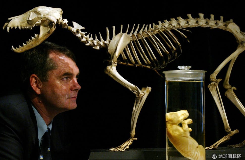 澳洲博物館館長阿契(Michael Archer)看著袋狼的骨骼標本和胚胎,目前的生物技術仍無法複製出一隻袋狼。