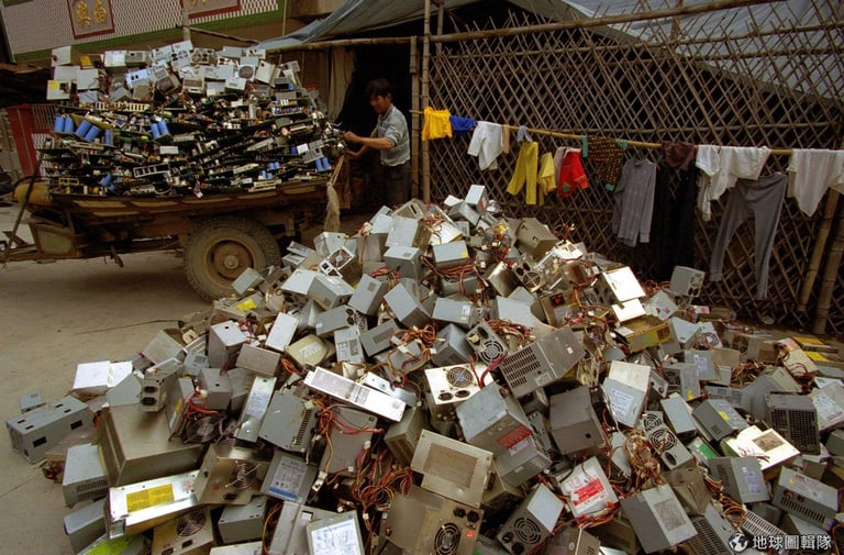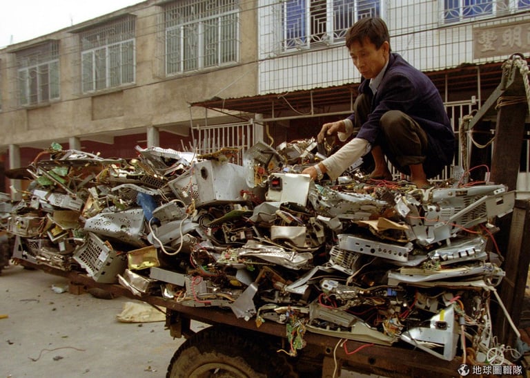 說到處理電子垃圾,又以廣東的「貴嶼鎮」最有名,當地現在就是世界上最大的電子垃圾處理場。走在鎮上,你舉目所及全都是線圈、管線、電路板堆積成的小山丘,隨時也可見坐在人行道上的鎮民,正努力地用電鑽和鐵鎚拆解家電。