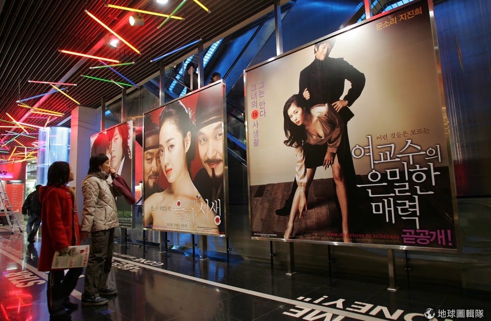南韓民眾看著眼前的電影海報。在民主化的南韓,隨著電影題材的鬆綁,出現了不少針貶時事、抨擊社會領導階層的電影。
