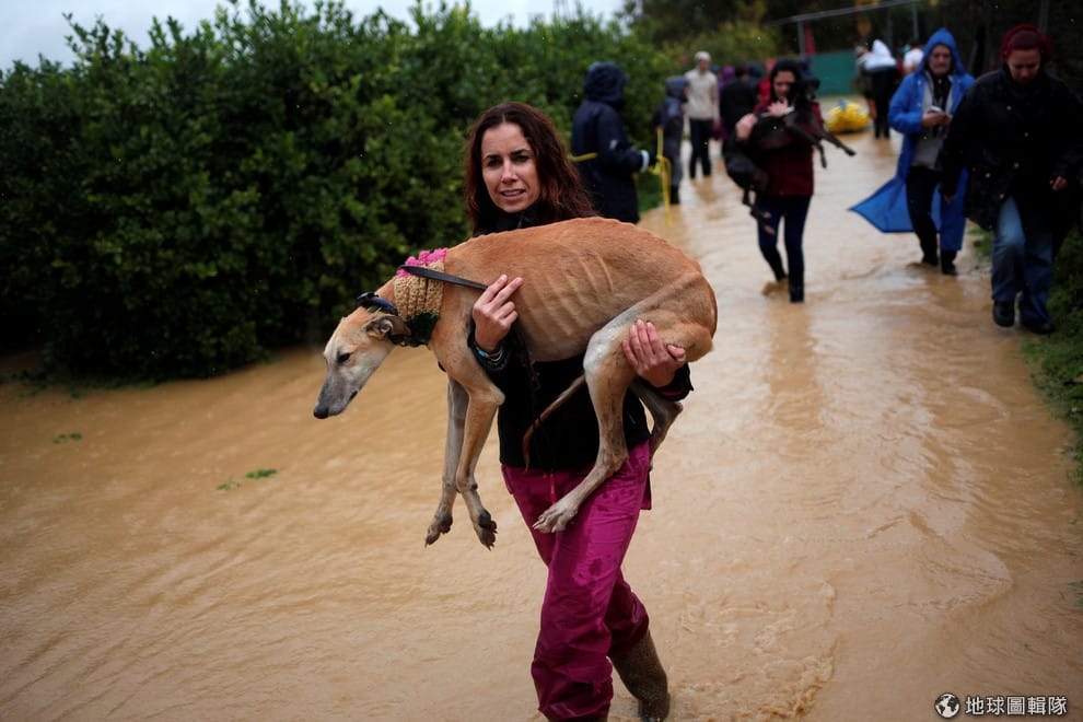 西班牙南部因為連日豪雨,造成水位上升引發洪患,志工們趕忙前往馬拉加省(Malaga)的獵犬庇護所將受困其中的獵犬們救出。
