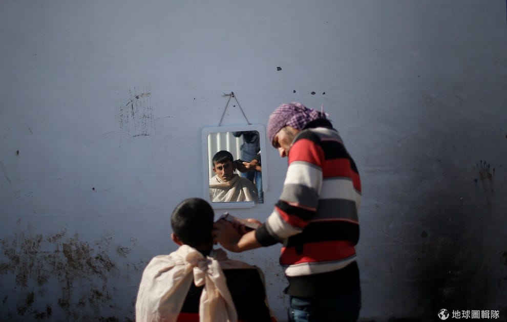 一名逃離伊斯蘭國(IS)的伊拉克難民正在剪頭髮。