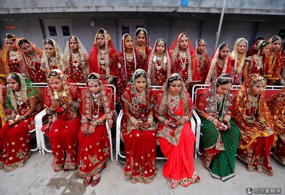 一群女子穿著華麗的紅色嫁紗,等待走向紅毯的另一端。