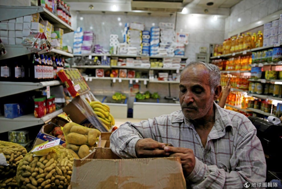 在首都開羅街頭,一名超市雇員一邊整理商品,一邊等待客人上門。