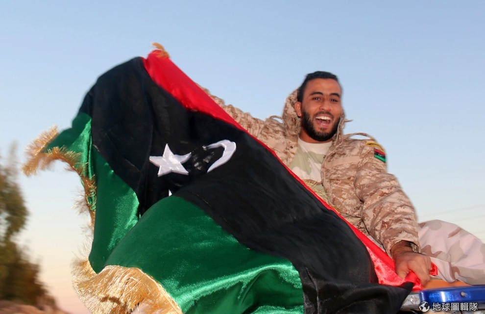 一名利比亞軍人開心地揮舞國旗,慶祝終於收復伊斯蘭國(IS)盤據的最後地點──拜哈里綠洲(Ghiza Bahriya)。